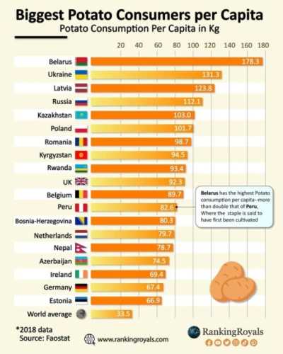 Найбільше картоплі споживають, звісно, в Білорусі — середньостатистичний житель цієї країни з’їдає 178,3 кг картоплі на рік. Це найбільший результат у світі. Друге місце…